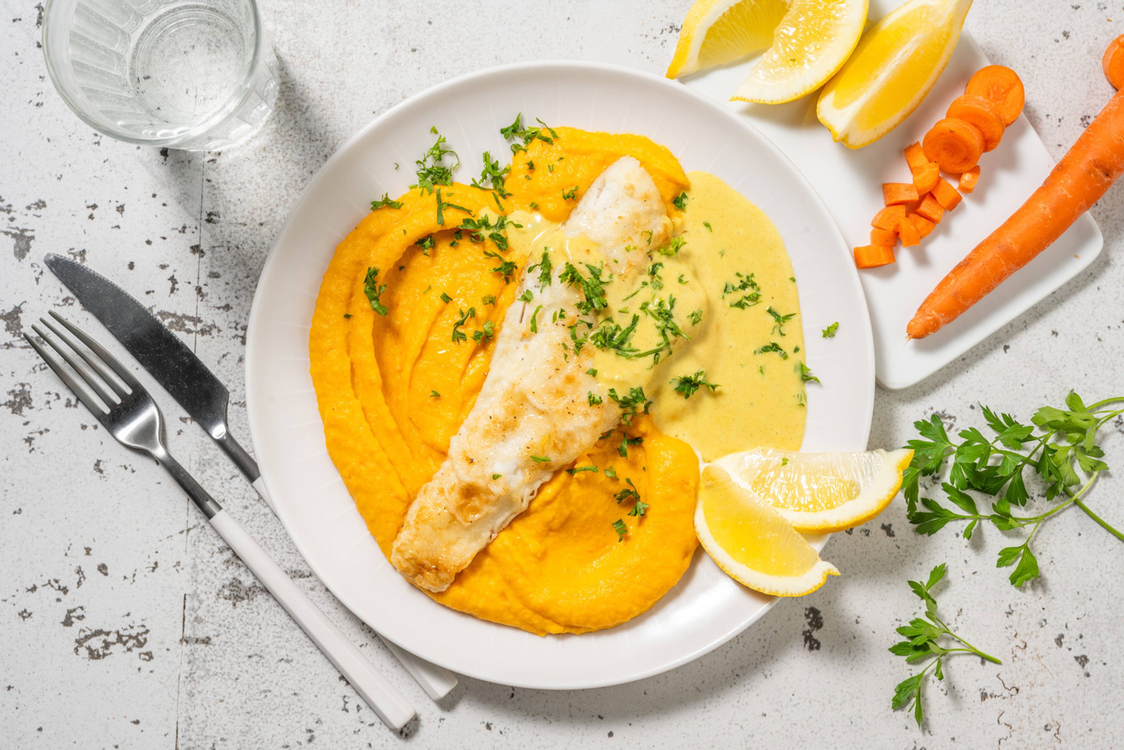 Le cabillaud est un poisson à la chair délicate qui ravit petits et grands. Son goût subtil se marie bien avec une sauce au yaourt entier et à la ciboulette. Le tout sera accompagné de potatoes et de carottes glacées. Késako ? Ce glaçage est une technique qui consiste à cuire des légumes entiers avec du beurre, du sucre et de l’eau. Résultat : un sirop qui les enrobe et les fait briller !