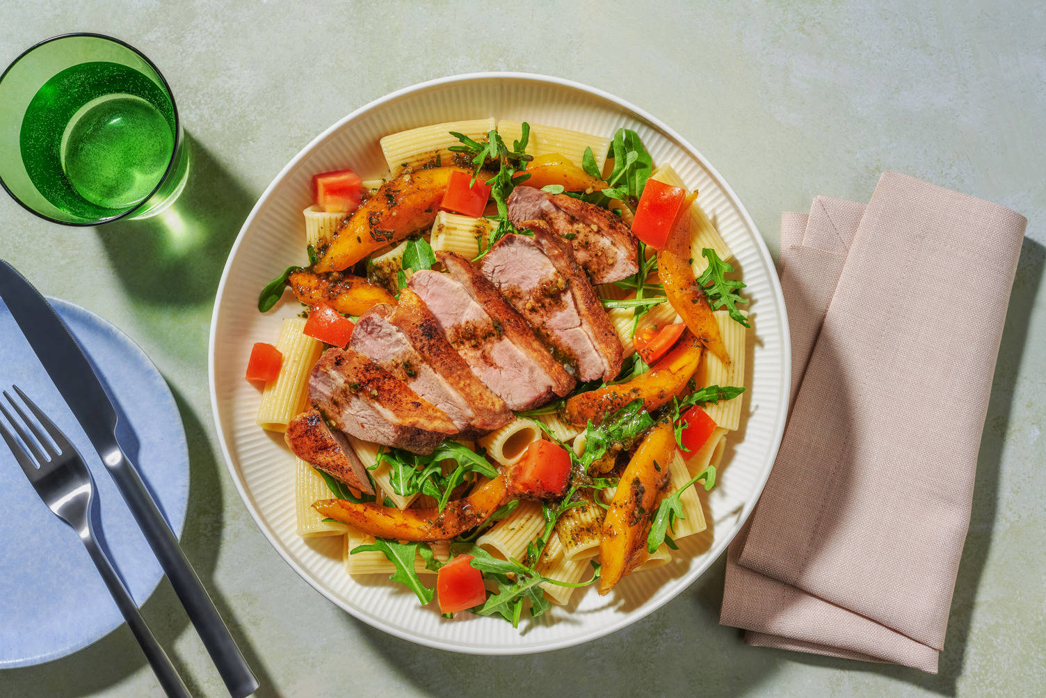 - Disposez la canette dans les assiettes. Ajoutez le butternut et les grenailles à côté.