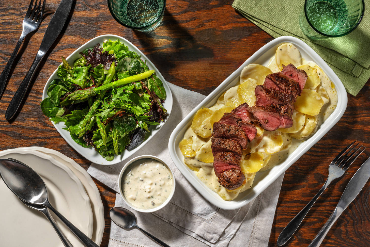 Servez la purée de pommes de terre et de betteraves. Présentez les asperges et le filet mignon à côté en nappant ce dernier de sauce. Garnissez avec le persil plat.