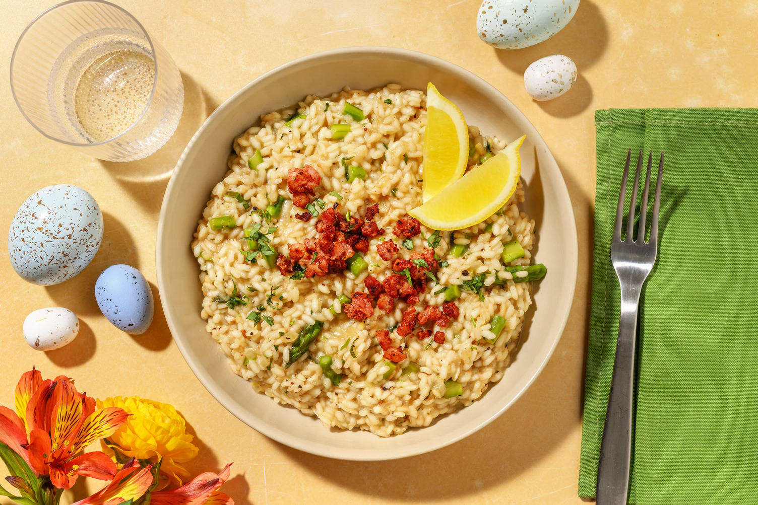 Pendant ce temps, coupez le pied des asperges sur 1 à 2 cm. Faites chauffer le reste du beurre dans l’autre poêle et faites cuire les asperges 5 à 10 minutes. Ajoutez le vinaigre balsamique blanc lors des 2 dernières minutes. Pendant ce temps, ciselez le persil plat.