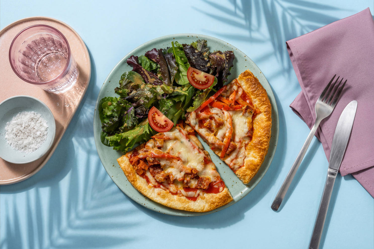 - Répartissez un peu de passata par-dessus, quelques dés de chorizo, puis saupoudrez de fromage râpé.