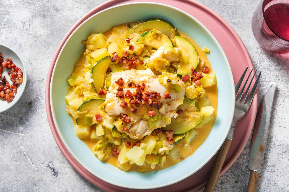 Servez les pommes de terre, retirez délicatement le poisson des légumes, puis versez le bouillon et les légumes sur les pommes de terre. Déposez délicatement le poisson par-dessus et parsemez-le de lardons.