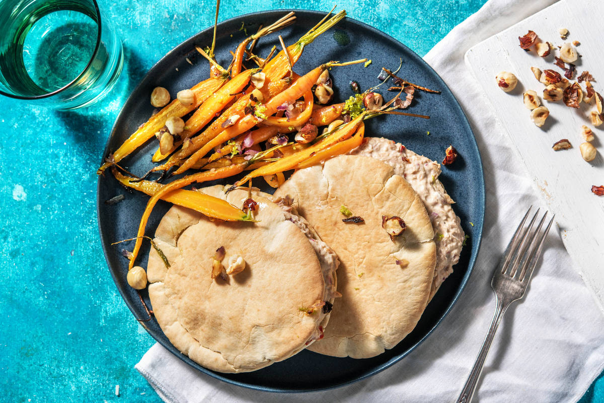 Humidifiez les pains pita, faites une petite ouverture et remplissez-les du mélange au thon. Enfournez-les avec les carottes lors des 5 dernières minutes de cuisson.