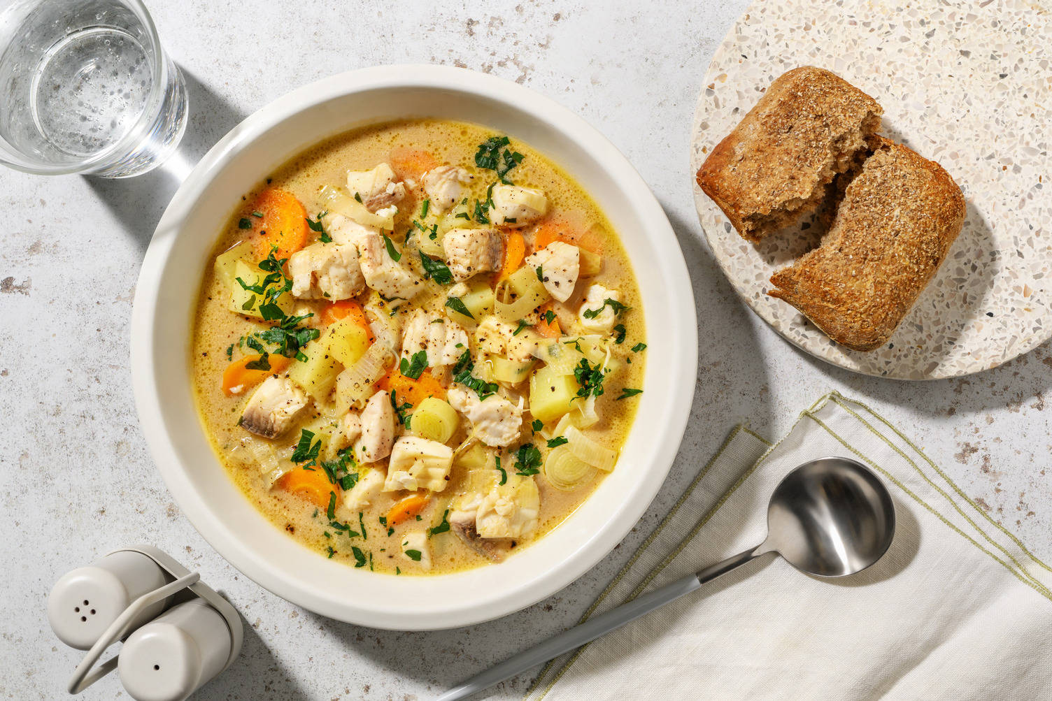Servez le poulet au thon avec le poivron rôti et le pain au levain tartiné de beurre aux fines herbes.