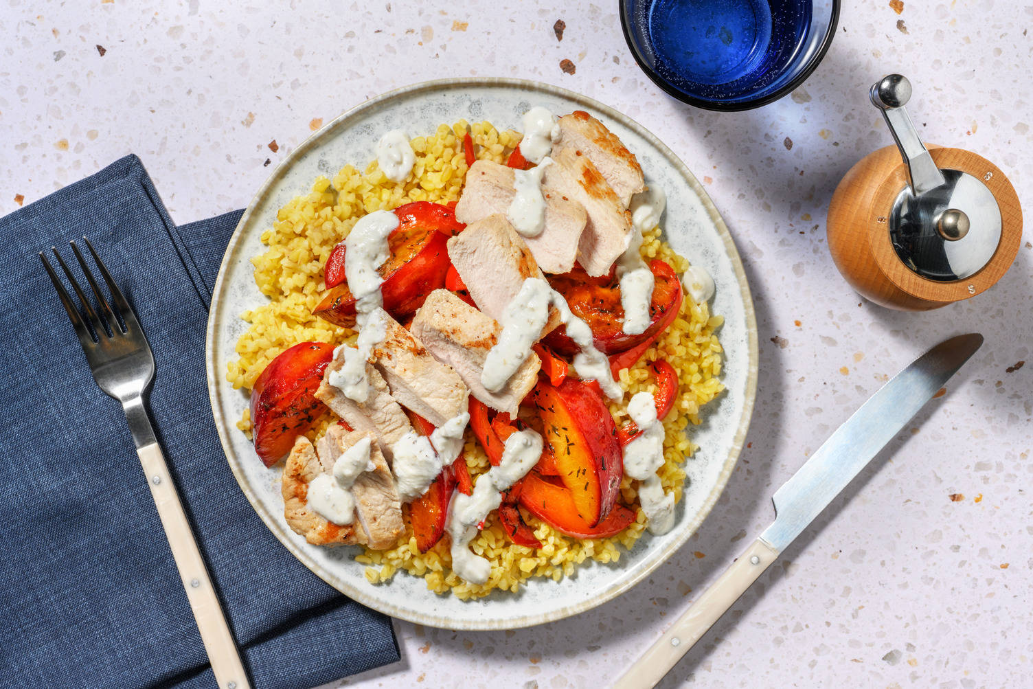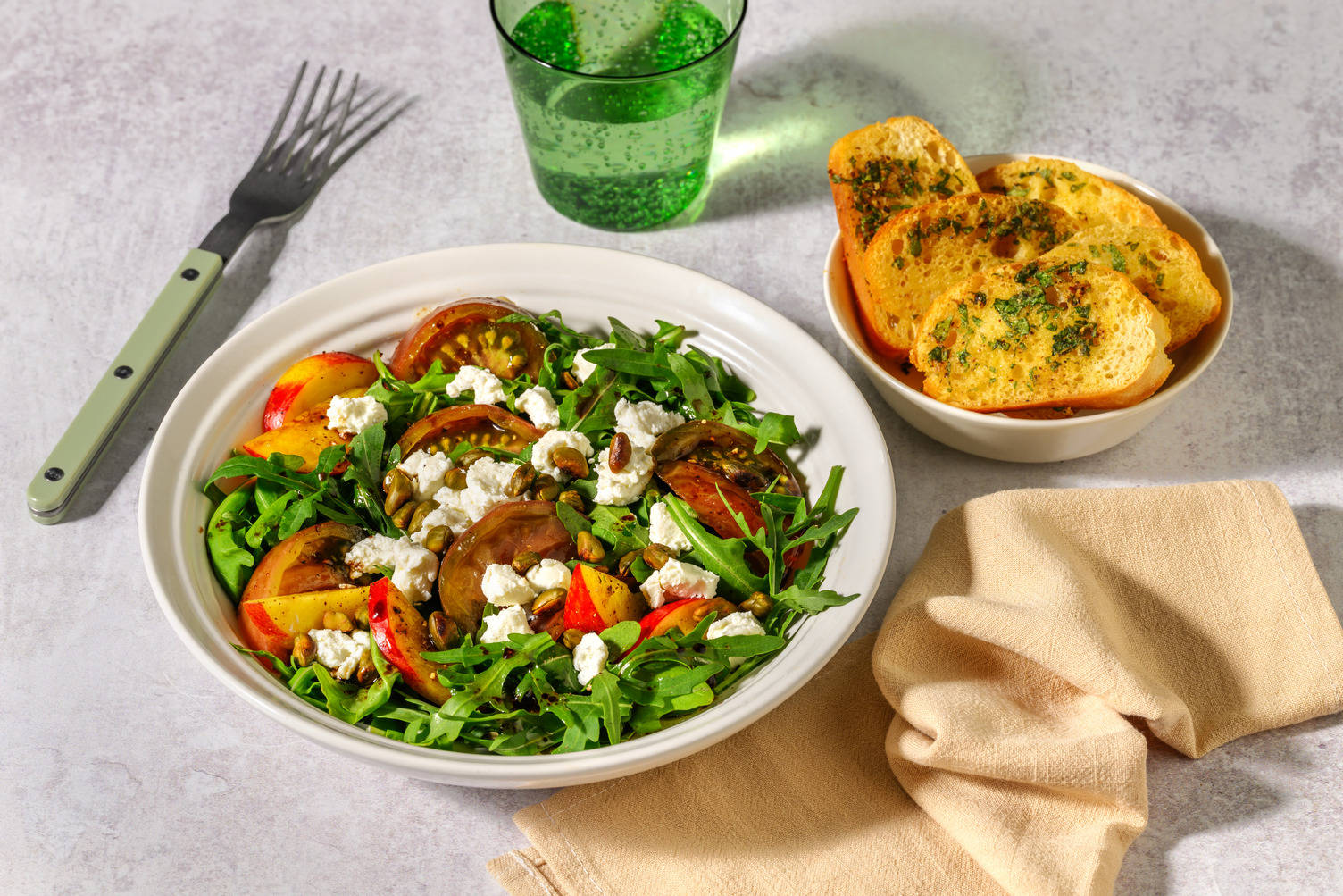 Préchauffez le four à 180 degrés. Équeutez les haricots verts. Coupez la nectarine en tranches. Coupez le poivron jaune et fines lanières. Émiettez le Danablu.