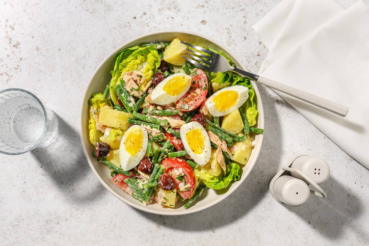 Immergez bien les haricots verts sous l'eau dans la casserole pour les faire cuire, puis portez à ébullition 6 à 8 minutes. Ils doivent être 'al dente'. Égouttez et laissez évaporer sans couvercle. Salez et poivrez. Ce n'est pas grave si les haricots refroidissent.
