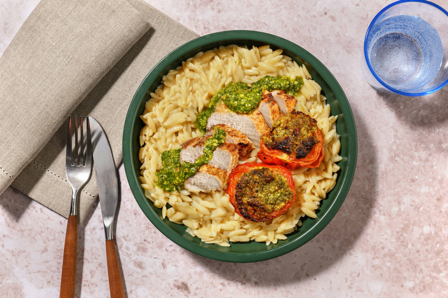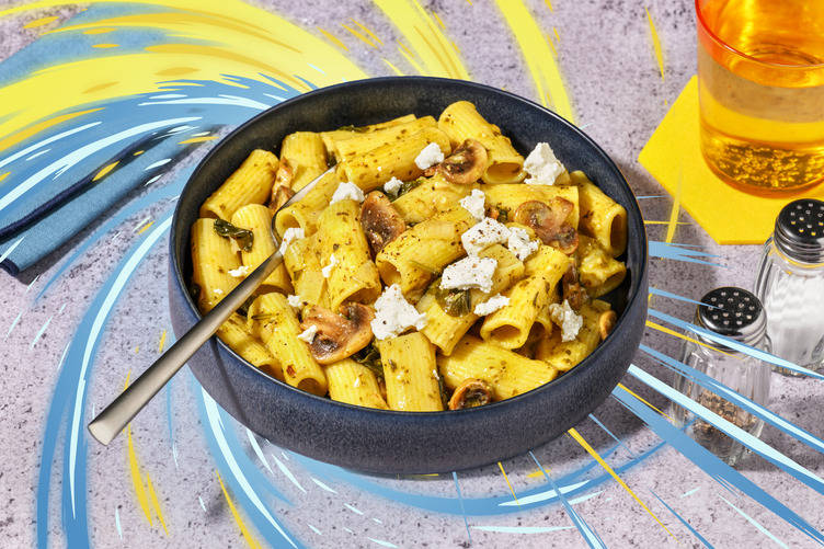 Ajoutez les fusilli et le pesto à la salade et mélangez bien le tout.