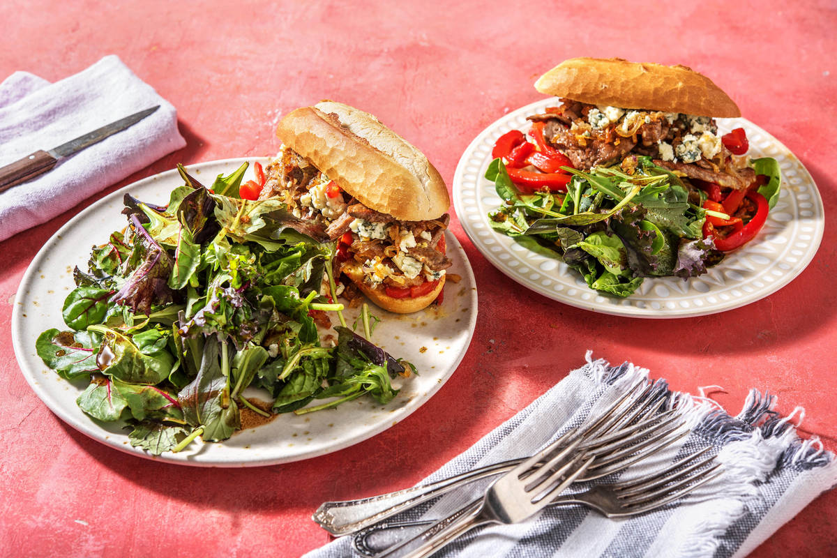 Ce sandwich au bœuf est une profusion de saveurs. Le sucré des échalotes caramélisées et le goût prononcé du bleu font un duo parfait pour accompagner le bœuf. Le fait de rôtir le poivron au four lui donne une saveur douce, un vrai délice !