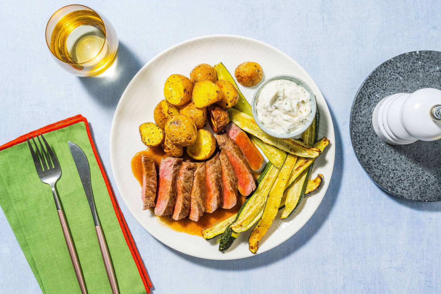 Pendant ce temps, émincez l’échalote. À l’aide d’un éplucheur, faites des lamelles de courgette longues et fines. Détachez les feuilles d’origan des brins et ciselez-les.