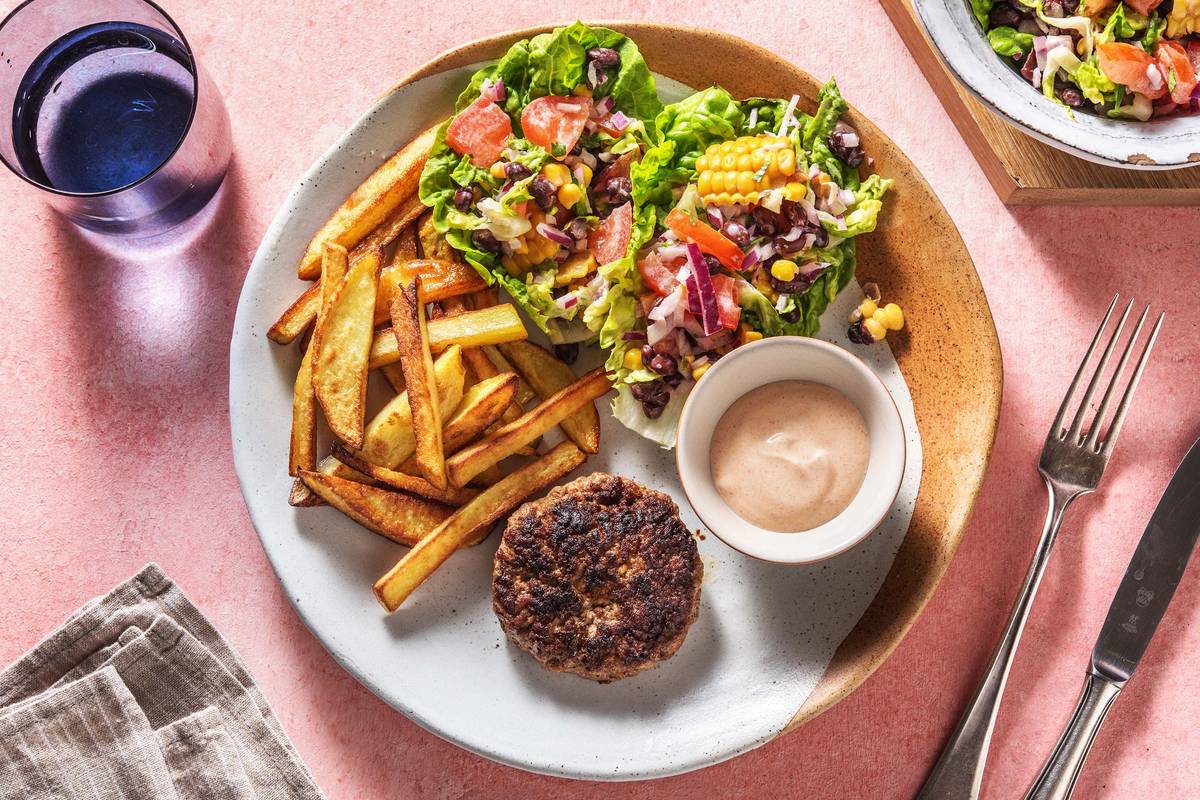 Cette recette est gourmande et légère à la fois. Ici, le steak haché de bœuf est relativement faible en graisse. Il est assaisonné aux épices mexicaines et est accompagné d'une salade de haricots non seulement délicieuse mais aussi riche en fibres et en protéines. Le tout est servi avec des frites au four, un vrai regal mais sans culpabilité !